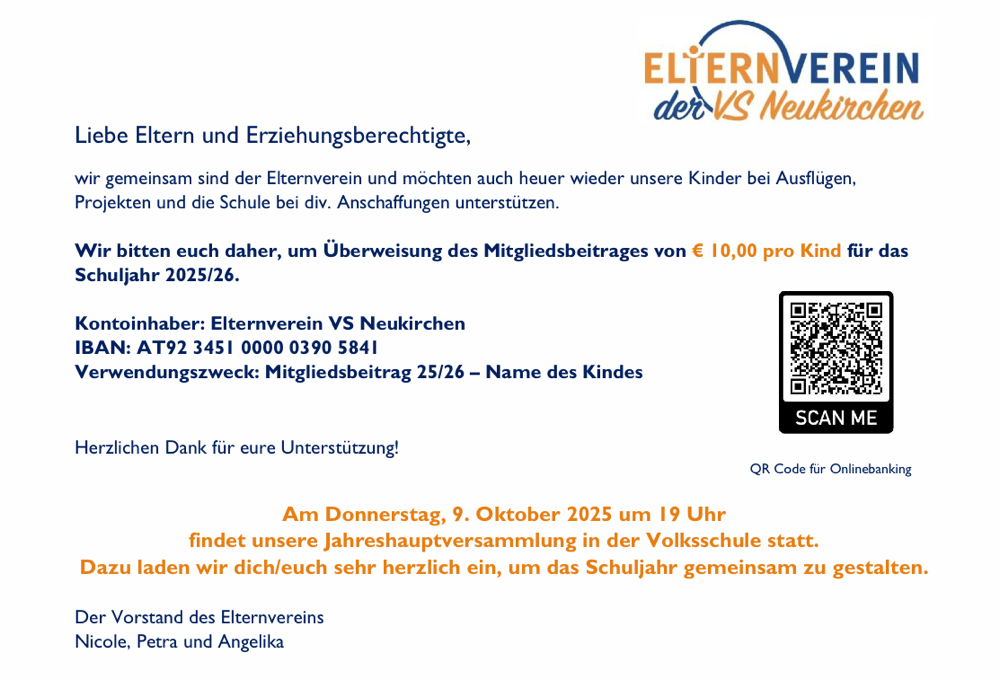 Nachdem nunmehr das - für uns alle ungewöhnliche - Schuljahr 2019/2020 zu Ende geht, möchte Euch auch der Elternverein der Volksschule Neukirchen nochmals informieren.